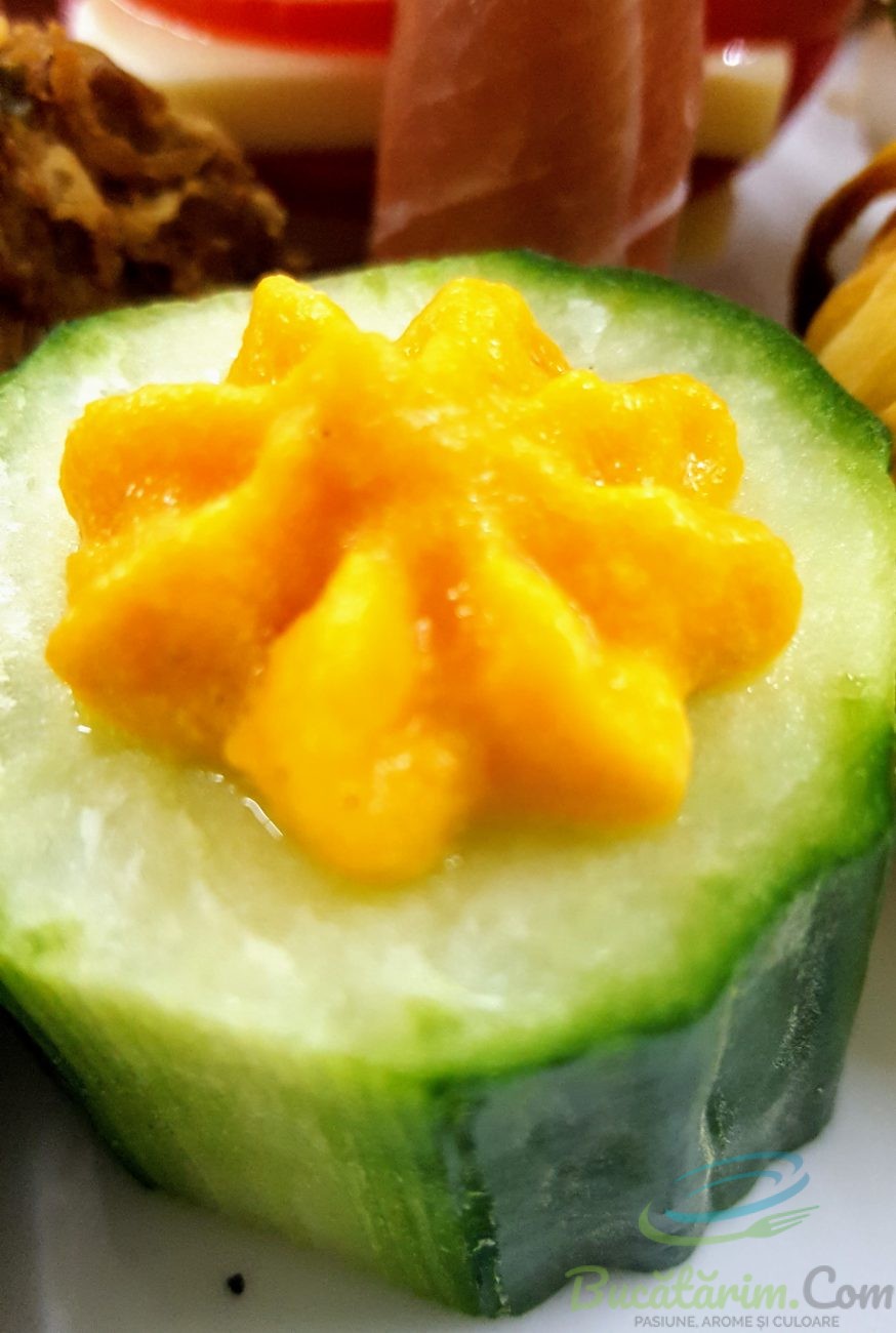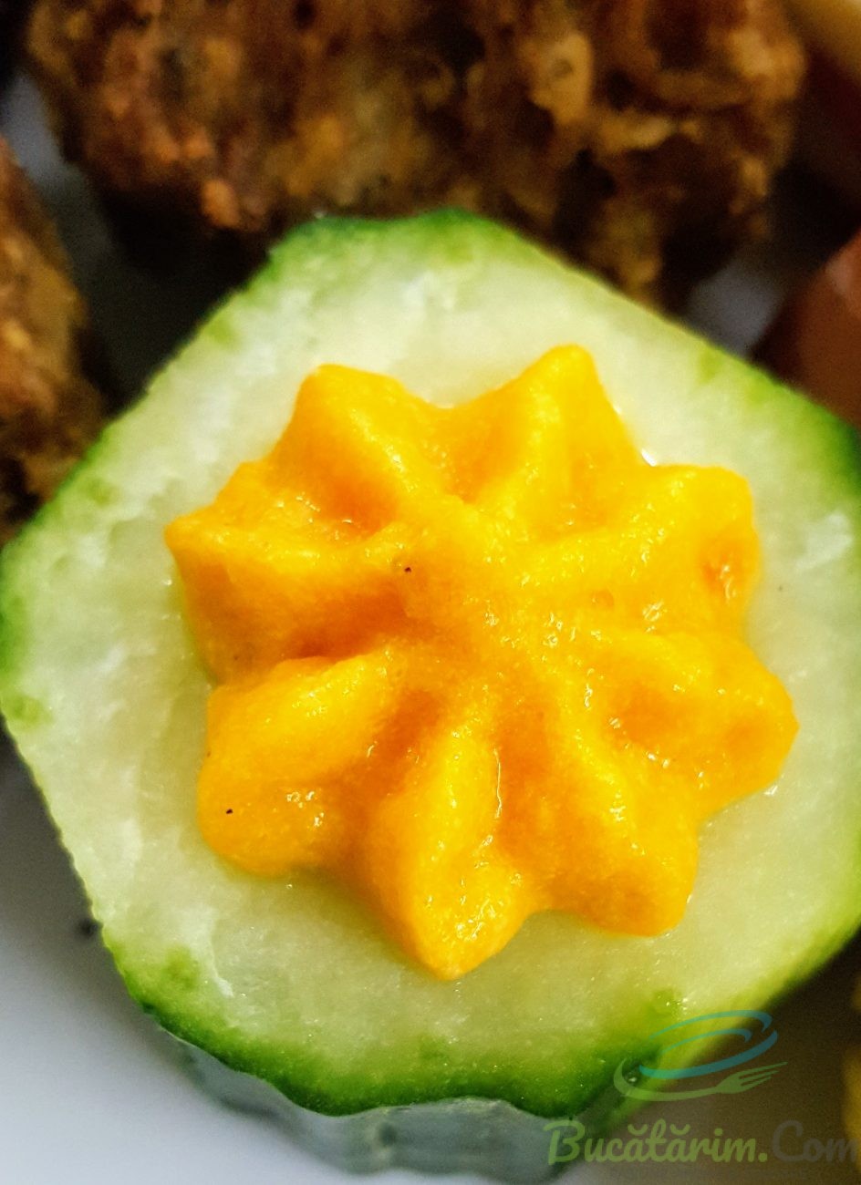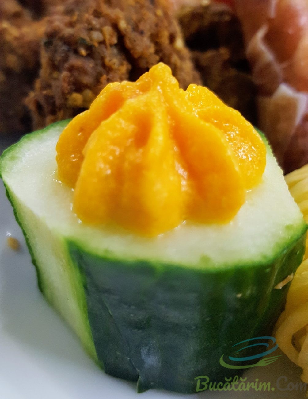 Albușurile se mixează spumă cât se poate de mult. Cu o lingură adăugați spuma în crema de morcovi și amestecați ușor pentru a se menține aerul din albuș. Ornati aperitive cu un poș cum ar fi castraveți proaspeți scobiți puțin sau serviți cu pâine prăjită ca un pate. Este o sursă bună de proteine, fibre și beta-caroten. Să vă fie de folos!
