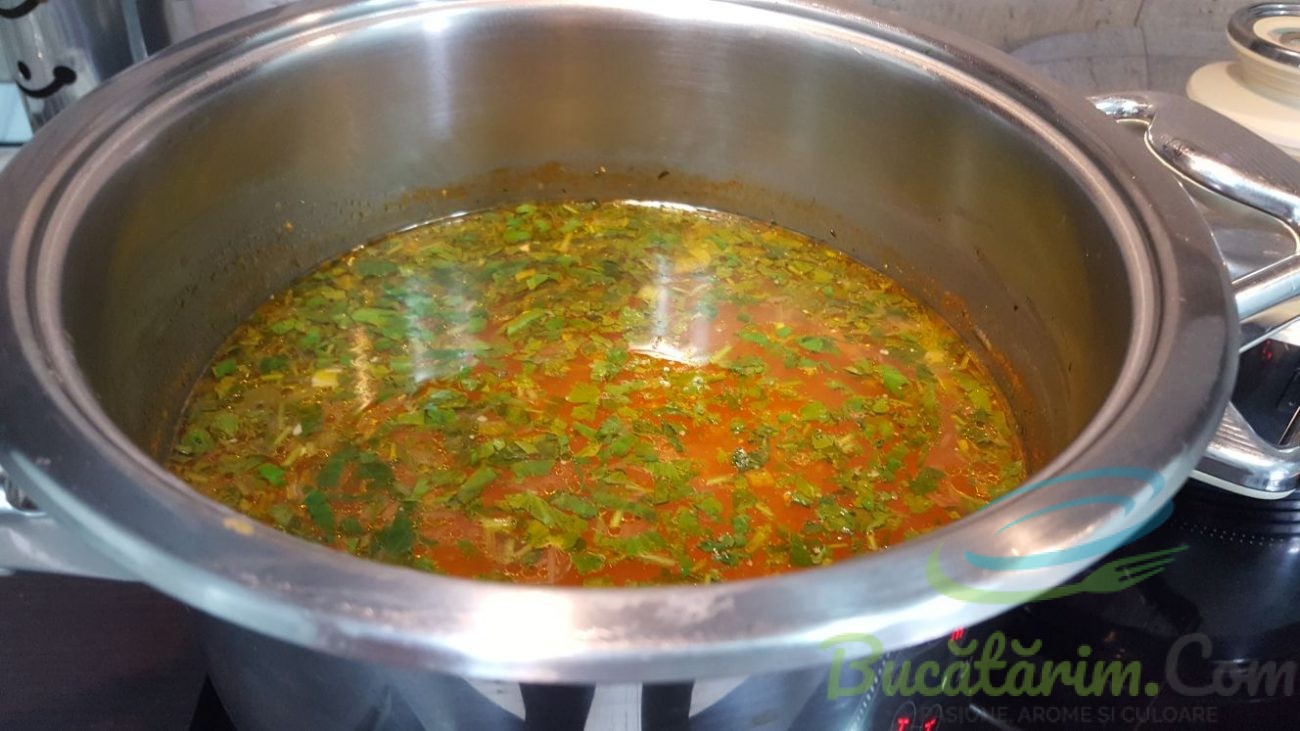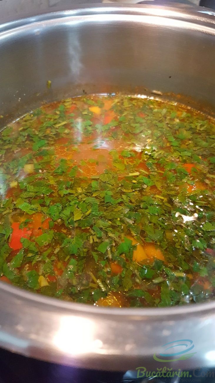 Opriti focul si rasturnati legumele peste perisoare. In cazul in care credeti ca carnea fierbe greu mai asteptati si dupa rasturnati legumele. Lasati sa fiarba la foc incet si adaugati rosiile curatate de pielita si taiate cuburi. Adaugati sare si piper si ce mai necesita dupa gustul fiecarui. La sfarsit de tot cine doreste poate acri cu bors facut in casa sau din plic o lingurita. Mai fierbeti 4-5 minute si opriti focul. Patrunjelul si leusteanul taiat proaspat il puneti in ciorba sa se infuzeze si aroma va cuceri. Pofta buna!